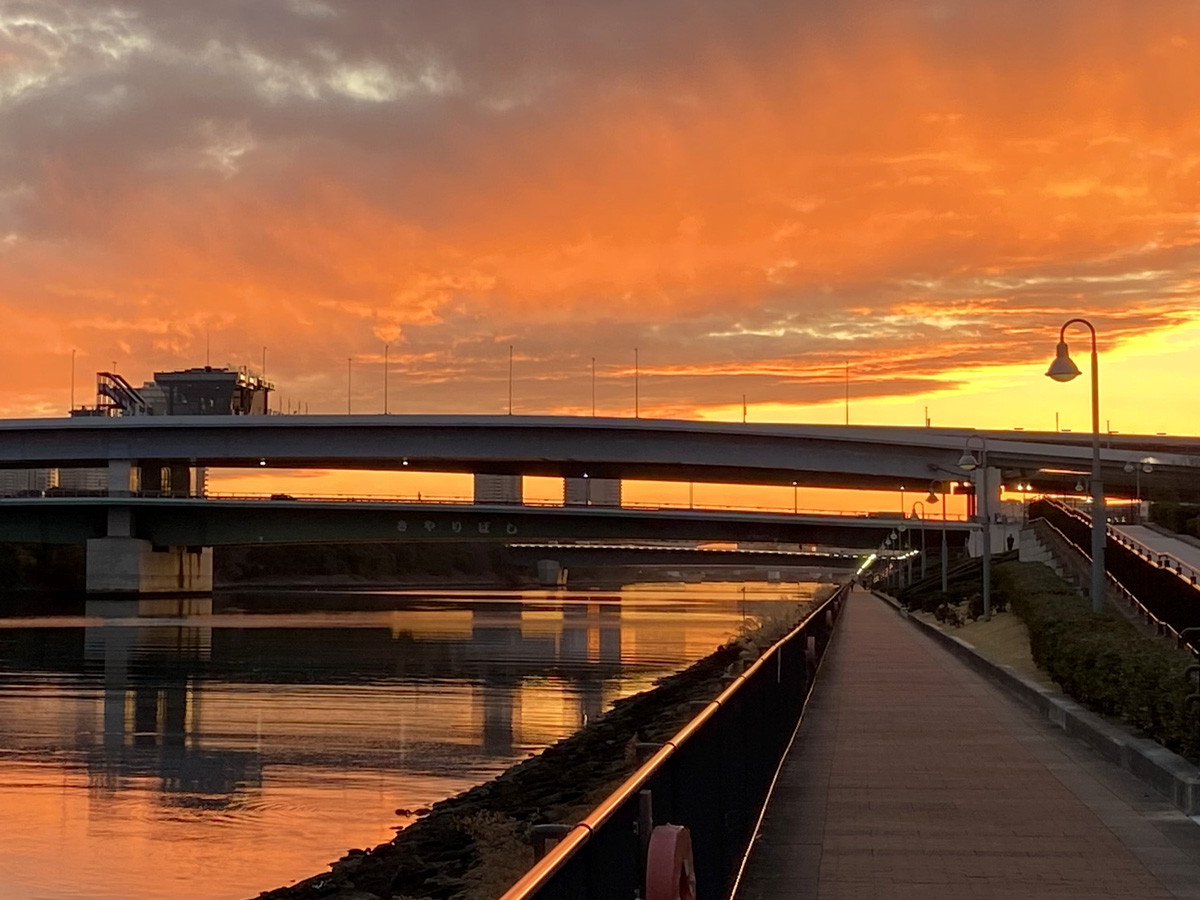 The area near Kiyari Bridge, overlooking Ariake Arena, boasts stunning vistas and wide-open views. At dusk, the setting sun bathes the bay in a soft twilight glow, creating an extraordinary magic hour. In winter, the waterside, buildings, and skyline are all painted in rose hues, enveloping the surroundings in a romantic, rose-colored twilight.
